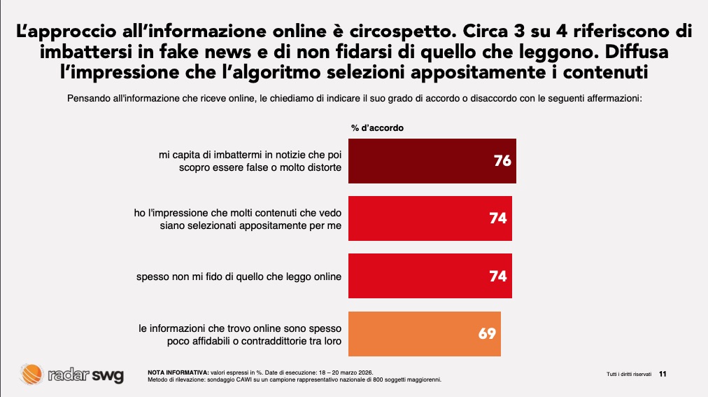 A questo si aggiunge un elemento ancora più delicato: la diffidenza. Circa tre italiani su quattro affermano di imbattersi frequentemente in notizie false e di non fidarsi pienamente di ciò che leggono online. Il fenomeno è amplificato dalla percezione di contenuti contraddittori e dall’idea che gli algoritmi personalizzino l’informazione, alimentando bolle informative e sospetti di manipolazione.