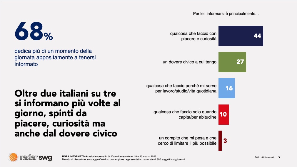 Per gli italiani, informarsi non è solo un gesto quotidiano: è un’abitudine radicata che unisce piacere, curiosità e senso civico. I dati dell’indagine Radar SWG sull’approccio all’informazione online restituiscono un quadro chiaro e, per molti versi, sfidante per chi opera nella comunicazione e nelle relazioni pubbliche.