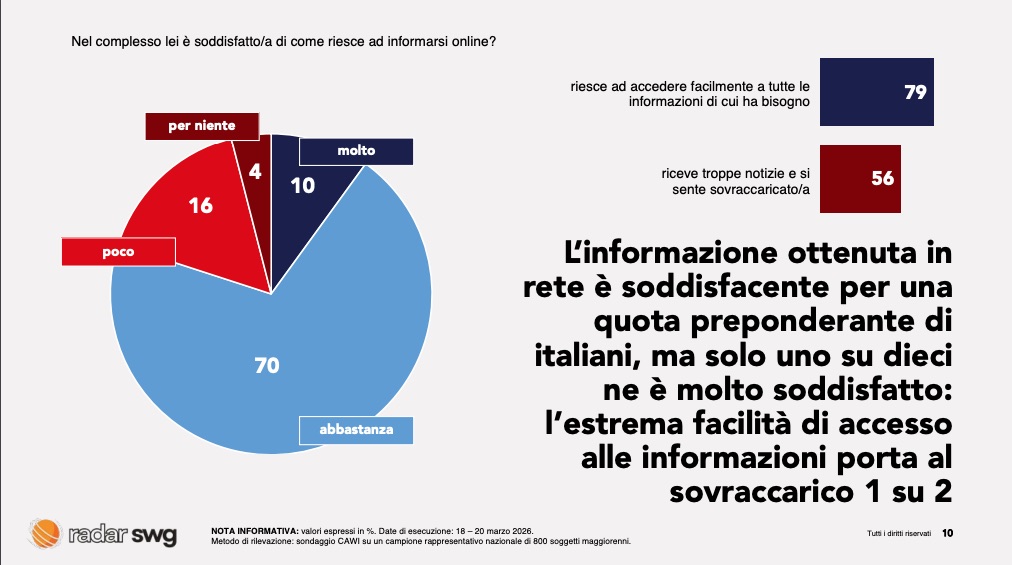 L’online si conferma il canale principale, apprezzato soprattutto per l’accessibilità e l’immediatezza. La possibilità di accedere facilmente a una molteplicità di fonti è considerata un valore. Ma è proprio questa abbondanza a generare una delle principali criticità: il sovraccarico informativo. Un italiano su due dichiara di sentirsi sopraffatto dalla quantità di contenuti disponibili, con il rischio di disorientamento e affaticamento cognitivo.